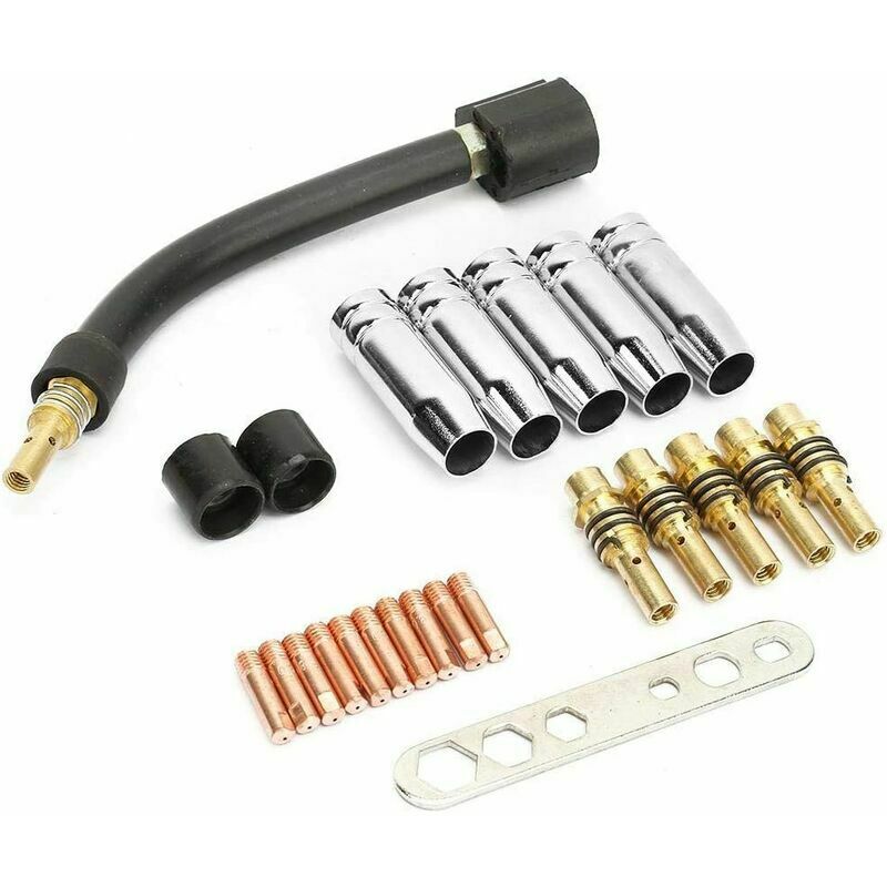 . Prestazioni stabili, lunga durata. Realizzato in materiale di rame di alta qualità per una buona conduttività termica e una lunga durata. < p>OmeVieni con una chiave per un facile montaggio e smontaggio. < p>Colore: oro+rame+trasparente+argento Specifiche: Materiale: rame Compatibile con torcia Binzel 15AK< /p> Elenco dei pacchetti: 10 punte di contatto da 0,8 mm 5 ugelli per gas 5 x porta punte 2 x manicotto isolante 1 x chiave inglese 1 x collo di cigno