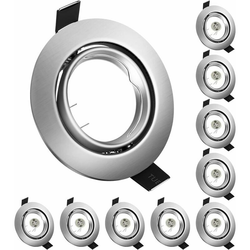 10 cornici da incasso rotonde per 230 V, le lampadine non sono incluse nella consegna. Dimensioni esterne: 90 mm, diametro del foro: 70-80 mm, profondità di montaggio con lampada: circa 75 mm. Adatto a tutte le lampade con un diametro di 50 mm, come lampade a LED o lampade alogene con interfaccia GU10 o MR16. Lo spot può essere ruotato da 39° a circa 35°, consentendo di dirigere la luce intorno alla stanza a un'area o un oggetto specifico.Facile sostituzione della lampadina: basta rimuovere la molla dall'anello interno per sostituire facilmente la lampadina senza smontare l'intero telaio.