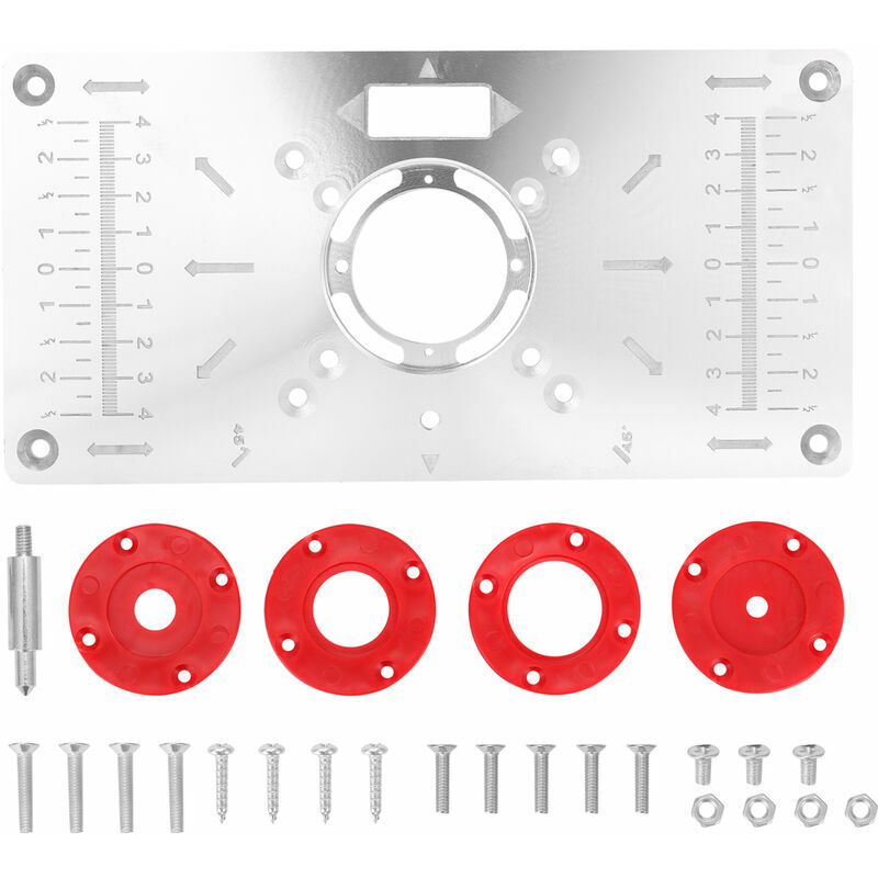 Incluso kit router fai da te per aggiungere il funzione di regolazione dell'altezza del router (è necessario praticare da soli il foro nella base del router). Piastra di inserimento multifunzionale con anelli, adatta per realizzare la propria tavola di fresatura per la lavorazione del legno di alta precisione. Caratteristiche: Piastra di inserimento multifunzionale con anelli, adatta per realizzare la propria tavola di fresatura per la lavorazione del legno di alta precisione.Realizzato in lega di alluminio ad alta resistenza per un uso duraturo.Il comodo anello del foro centrale utilizzato per il router è allineato in modo che sia centrato nel foro della punta. È facile da usare, risparmiando fatica e lavoro, e facile da maneggiare ed estendere l'uso della macchina da taglio allo stesso tempo. La lavorazione CNC ad alta precisione rende la qualità perfetta. Compatibile solo con Bosch GKF550 e Makita RT0700C. Caratteristiche: Materiale: realizzato in lega di alluminio Dimensioni