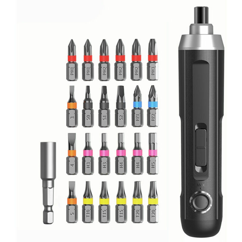 Accessori: set CR-V/25MM incluso (quadrato: S0, S1, S2 Carattere medio: PZ1, PZ2 Tipo a croce: pH1*2, pH2* 3, pH3 Carattere A: SL3, SL4, SL5 Esagono stella: T10, T15*2, T20*2 Esagono: H5, H4* 2, H3*2, asta estesa*1) Specifica: DC 12V/2000MAH Tensione: 3,6V Capacità della batteria: 2000mAh Corsa massima: 5n m Illuminazione: supporto Metodo di ricarica: USB Tempo di ricarica: 1-2 ore< /p> pacchetto include: 1 cacciavite elettrico 25 punte per cacciavite