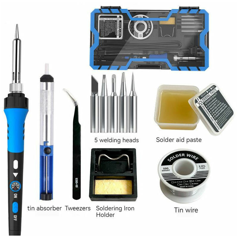 Saldatore elettrico intelligente a temperatura costante con riscaldamento interno in ceramica, riscaldamento rapido, controllo intelligente della temperatura, ABS antiscivolo Saldatore elettrico con riscaldamento interno, nucleo riscaldante interno riscaldante, riscaldamento rapido.< br/>Rotazione regolabile temperatura: regolare nella posizione appropriata, temperatura regolabile da 200 a 450 °C, per soddisfare le diverse esigenze di temperatura. stagno superiore e inferiore. La combinazione include: Set da 8 pezzi, saldatura per regolazione della temperatura blu ferro + supporto per saldatore + 5 teste + filo di stagno + pasta saldante + dispositivo di aspirazione dello stagno + pinzette + kit di attrezzi