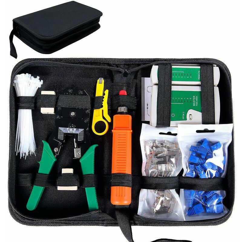 Descrizione del prodotto: Portatile: gli strumenti di manutenzione della rete di computer 10 in 1 includono strumenti di test della rete e strumenti di riparazione, che sono ricchi di funzionalità e piccoli. Conveniente: 10 in 1 include strumento di crimpatura, tester di rete, connettore al quarzo RJ45, coperchio del connettore, perforatore, accoppiatore RJ45, accoppiatore a 3 vie, spelafili, fascetta in nylon. Versatile: questo prodotto ti consente di testare la tua rete e garantire la manutenzione e la riparazione del tuo computer di rete. Design ragionevole: una custodia in nylon con cerniera per riporre e organizzare ordinatamente tutti gli strumenti di manutenzione.