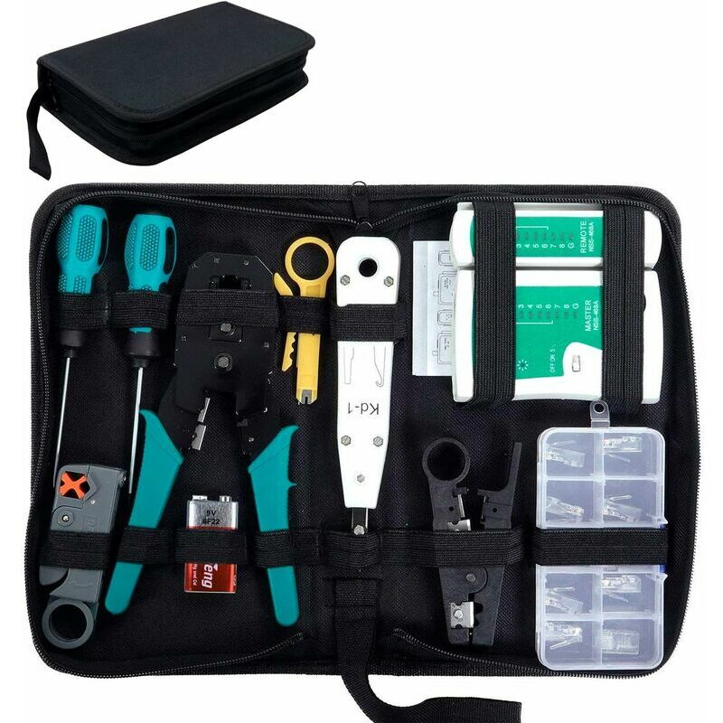 PORTATILE: gli strumenti di manutenzione della rete di computer 12 in 1 di strumenti di tester di rete, di piccole dimensioni, strumenti di riparazione e completi DUREVOLE: metallo duro e plastica ABC, materiale certificato e resistente. PRATICO: 12 pollici 1 include pinze a crimpare, tester di rete, connettori in cristallo RJ45, coperchi dei connettori, strumenti di punzonatura, accoppiatore RJ45, accoppiatore a 3 vie, cavo spelafili, serracavo in nylon. computer.DESIGN RAGIONEVOLE: una borsa con zip in nylon per riporre e organizzare tutti gli strumenti di riparazione in ordine. Kit di strumenti di riparazione e manutenzione della rete di computer professionale che è 100% nuovo di zecca e di alta qualità < p>Il set di strumenti di riparazione include: 1. Pinza a crimpare: è uno strumento di crimpatura / taglio / spelatura 3 in 1, adatto per connettori RJ-45, RJ-11, RJ-12 e adatto per cavi e cavi Cat5 e Cat5e con spina 8P8C, 6P6C e 4P4C . 2. Tester per cavi di rete (per testare cavi