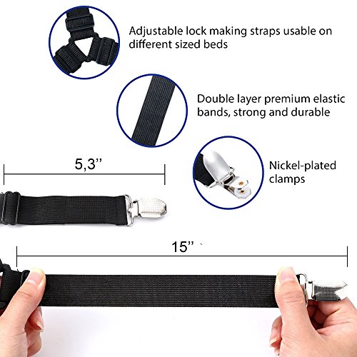 ✔️ Questi elastici per lenzuola hanno delle resistenti molle in metallo con dentini di plastica. I dentini di plastica assicurano che la cinghia mantenga fisse e ferme le lenzuola. Sono ideate per essere agganciate a lenzuola e altri tessuti in modo deciso senza strappare o rovinare le tue lenzuola.