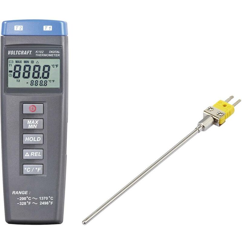 Dettagli tecnici Alimentazione elettrica Batteria 9 V (1x) Calibrato di fabbrica senza certificato Dimensione del prodotto, larghezza 54 mm Dimensione del prodotto, lunghezza 164 mm Dimensioni (L x L x A) 164 x 54 x 34 mm Dimensioni prodotto Altezza 34 mm Modello (in generale) 2 canali Peso 180 g Precisione (più / meno) 0.3 % Precisione di base (+/-) °C 1 °C Risoluzione (temperatura) 0.1 °C Sensore tipo K Temperatura (max.) +1370 °C Tipo prodotto Termometro Intervallo di misura sensore: da -100 a 300 °C Precisione di misura: sensore di 2,5 °C Termometro digitale + sensore ad immersione L'approccio conveniente alla misurazione della temperatura professionale. Il K102 è uno strumento di misura della temperatura pregiato e robusto al prezzo premium. Il sensore ad immersione (tipo K) TP-200 di VOLTCRAFT è particolarmente adatto per la misurazione della temperatura di liquidi, metalli liquidi o sostanze simili ai gel. Il sensore è adatto per un intervallo di temperatura da -100 a 300°C che