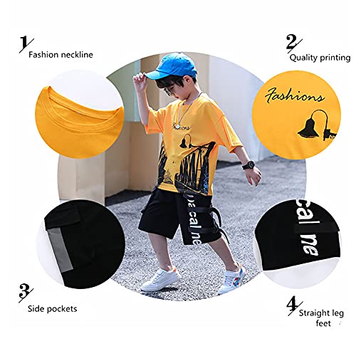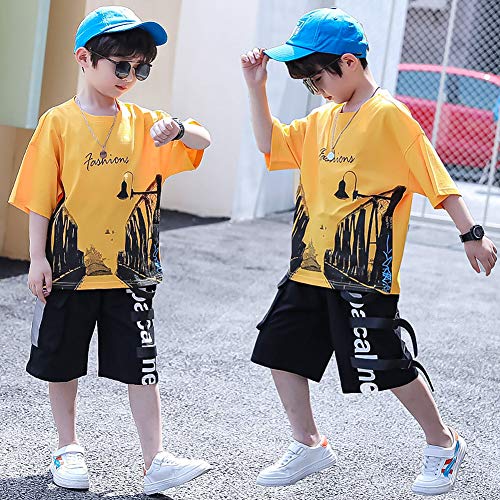 Volunboy Set di 2 T-Shirt e Pantaloncini per Ragazzi, Magliette con Stampa Jeans Shorts(6-7 anni,Giallo,Taglia 130)