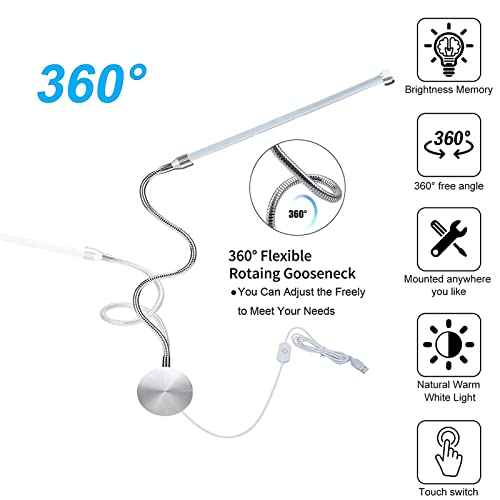 ▲ Lampada da lettura a letto: lampada da parete a LED da 6 W con interruttore touch e adattatore UE, Il cavo USB è collegato all'alimentazione e può essere collegato a dispositivi di interfaccia USB come adattatori EU, computer, power bank, ecc. Collo di cigno bianco argento con superficie liscia, stile minimalista, perché l'atmosfera piacevole e morbida per gli occhi è più rilassante, buon assistente per la vostra lettura serale