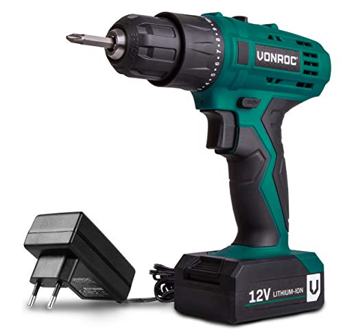 VONROC Trapano avvitatore a batteria 12V. Set con 1 batteria 1.3Ah e caricabatterie rapido. Mandrino 10mm. Coppia max 20Nm