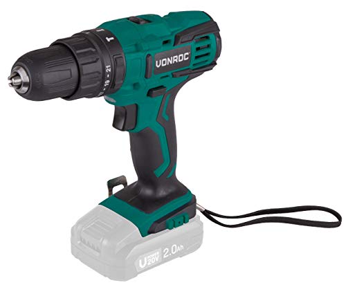 VONROC Trapano Avvitatore a batteria VPOWER 20V 40Nm. Funzioni di perforazione, percussione e avvitamento. Include 2 punte e sacca portautensili. Batteria e caricabatterie non inclusi
