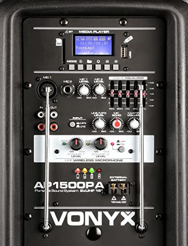 Vonyx AP1500PA - Sistema PA Mobile, Woofer 15", Potenza in Uscita: 800 W, Bluetooth/USB/SD/MP3/AUX-In, Auricolare UHF da Tasca, Microfono UHF, Microfono via Cavo, Batteria Ricaricabile, Telecomando