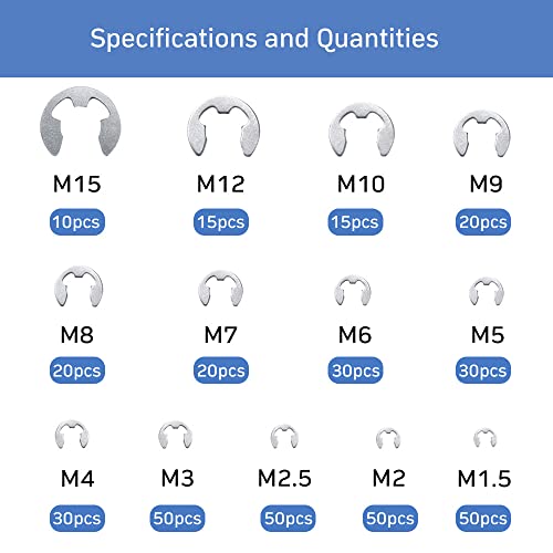 VooGenzek 390 Pezzi Rondelle di Sicurezza per Alberi Set, Anello di Sicurezza con Apertura a Scatto, Anello di Fissaggio a Clip in Acciaio Inox, 13 Taglie M1.5/2/2.5/3/4/5/6/7/8/9/10/12/15 con Scatola