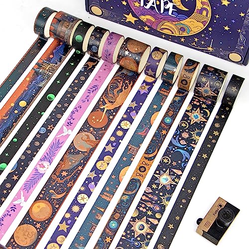 Magic Theme Design - 29 rotoli di nastro adesivo per mascherare Magic Theme. Ogni rotolo di nastro Washi contiene vari elementi magici, tra cui stelle, mezzalune, streghe, castelli, gemme, galassie, draghi e altri elementi magici. Il nastro Washi ha colori ricchi e motivi diversi che spezzano la tradizionale impressione del nastro washi.