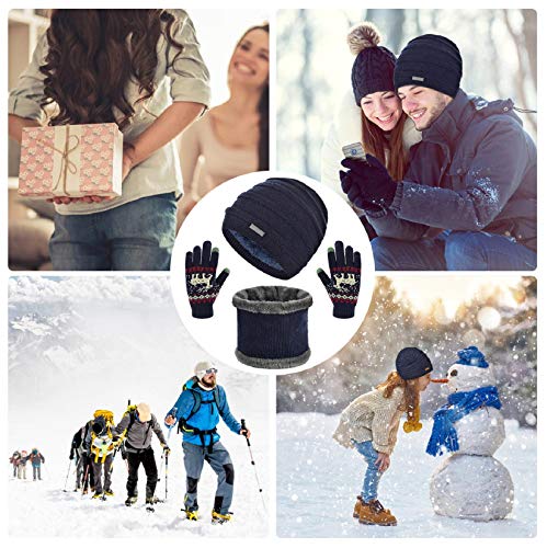 Voqeen Cappello Sciarpa e Guanti Set Invernale Berretto in Maglia Caldo Cappelli da Donna Guanti Touch Screen Invernali Beanie Regalo di Natale Interna con Fodera Moda 3 Pezzi(Blu)