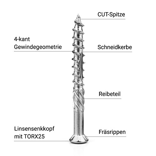 la terrazza viti sono Witte Run intemperie, antiruggine e sono costituite da un forniscono C1 acciaio inossidabile (priva martensitischer sostanza 1.4006).