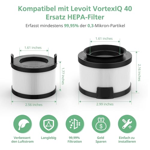 Doppia filtrazione HEPA in 4 fasi: Come parte del sistema di filtrazione a 4 livelli dell'aspirapolvere, questi 2 filtri Hepa per Levoit VortexIQ 40-RF possono catturare il 99,95% delle particelle con una dimensione di 0,3 micron o superiore, può migliorare la qualità dell'aria in casa e una migliore aria fresca e un clima più sano, particolarmente utile per le case con bambini, animali domestici o I fumatori.