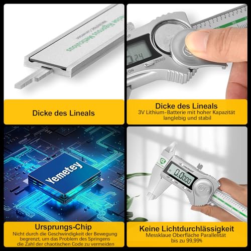 ⚙️Calibro di precisione - La griglia fissa in vetro appositamente lavorata impedisce ai calibri a corsoio di perdere precisione a causa dell'umidità ambientale e del magnetismo. Il chip di sovravelocità incorporato con protezione elettrostatica avanzata mantiene la stabilità digitale;