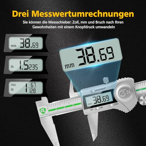 Conversione di 3 Unità - Converti pollici, mm e frazioni, in base alle tue abitudini con la semplice pressione di un pulsante. Premere il pulsante on/off, far scorrere il calibro digitale in qualsiasi posizione, quindi leggere i valori sullo schermo. E puoi resettarlo a zero con il tasto zero. Gli strumenti di misurazione da 150 mm sono ancora utilizzati da professionisti e hobbisti, gioiellieri, hobbisti, carpentieri e appassionati di fai da te.