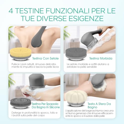 Set Per La Pulizia Del Corpo - 4 Testine multifunzionali, soddisfano le diverse esigenze di pulizia del corpo. Se hai la pelle sensibile, sentiti libero di usare una spazzola morbida. Per strofinare, scegli una spazzola a setole elastiche.