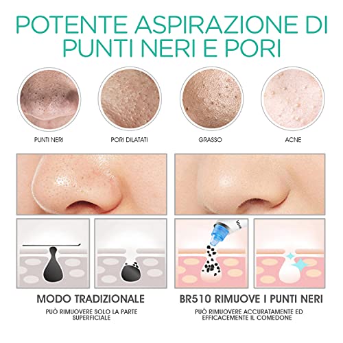 6 TESTE MULTIFUNZIONALI INCLUSE - Include 1 x testa grande foro circolare per una forte aspirazione, 1 x testa piccolo foro circolare per un'aspirazione regolare, 1 x testa microcristallina per l'esfoliazione della pelle morta, 1 x testa ovale per ridurre le rughe e levigare linee di espressione, 1x testa di foro curva per un'aspirazione super forte su aree della pelle difficili da raggiungere, 1 x testa di silicone per aspirazione morbida su aree della pelle sensibili.