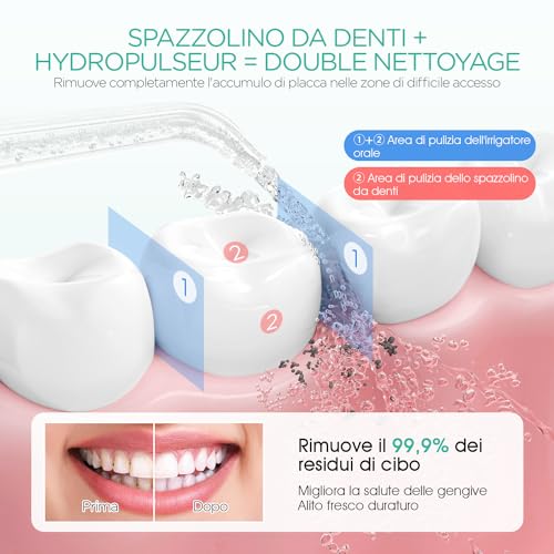 Pulizia Profonda, Miglioramento della Salute delle Gengive - Una sciacquatrice dentale elettrica portatile con flusso d'acqua pulsante di 1400-1800 volte/min, pressione dell'acqua di 45-120 PSI e ugello rotante a 360°. Rimuove placca e tartaro radici e solchi parodontali inaccessibili a spazzolino e filo interdentale. Massaggi gengive, migliora circolazione sanguigna. Ideale per ortodonzia e ponti.