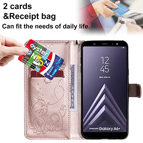 VQWQ Custodia in Pelle Samsung Galaxy A6 Plus 2018 - Custodia Flip con Supporto Gatto e Ape Cover con Porta Carte Portafoglio Magnetica Wallet Case per Samsung Galaxy A6 Plus 2018 [Carino] -Oro rosa