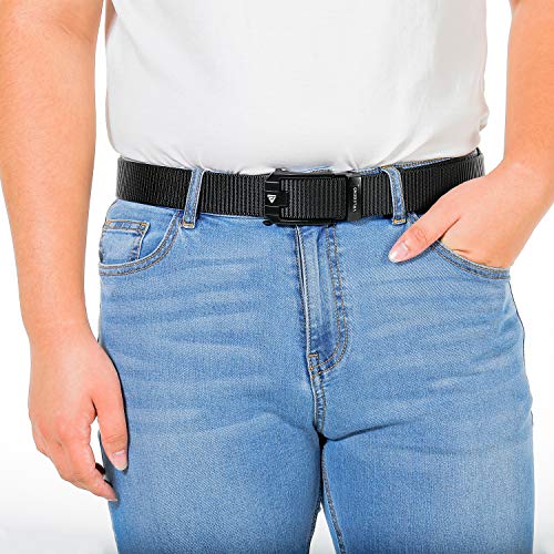 Facile da usare: questa cintura in nylon a cricchetto è molto comoda da usare, il meccanismo di blocco è semplice ma affidabile, terrà saldamente i pantaloni, inoltre con la fibbia a sgancio rapido puoi bloccare / sbloccare la cintura in un secondo