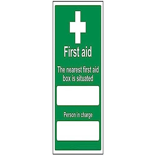 Orientamento verticale.Il cartello dice "Si trova la cassetta di pronto soccorso più vicino. Persona responsabile"