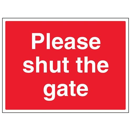 Orientamento orizzontale. Il cartello presenta la scritta in inglese: "Please shut the gate".