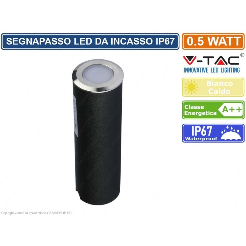 Segnapasso LED V-Tac VT-1141 da interramento, con potenza di 0,5W. Forma circolare con controcassa in plastica nera, copertura dei LED opaca e corona di colore argento satinato. LED SMD con fascio luminoso di 90° e flusso luminoso di 5 lm. L'alimentazione che deve essere di 12V DC, può avvenire tramite driver non incluso. Ideale per l'illuminazione di piante e cortili, e grazie al grado di protezione IP67, è adatto a resistere per molto tempo interrato ed esposto alle intemperie. Dotato di cassero estraibile per un facile interramento e istruzioni per il montaggio. Questo modello di punto luce è disponibile con Luce Bianca Calda 3000K (SKU 1463). Dimensioni: Ø 26 x 82 mm.