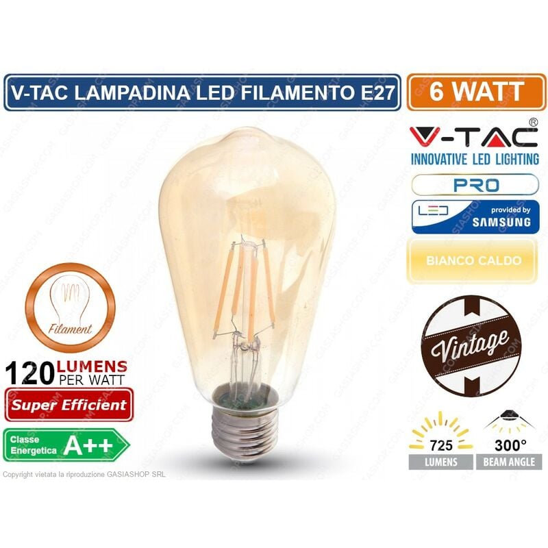 Lampadina LED V-Tac VT-276 Bulb ST64 con potenza di 6W e attacco E27. Realizzata in vetro ambrato e alluminio. LED a Filamento, fascio luminoso di 300° e flusso luminoso di 725 lm. Questa lampadina che si caratterizza per una super efficienza A++, ha un rapporto di 120 lm/W. La potenza di 6W è equivalente a 55W di una lampadina ad incandescenza. Il vetro ambrato dona uno stile vintage alla lampadina, questo la rende adatta ad ambienti soft, delicati e dallo stile semplice ma ricercato. Questo modello di lampadina è disponibile con Luce Bianca Calda 2200K (SKU 290). Dimensioni: Ø 64 x 138 mm.