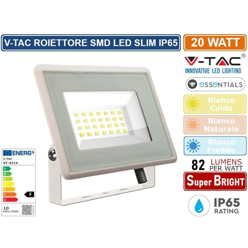 V-Tac VT-4924 è un faro LED da 20W di potenza con tecnologia LED SMD, corpo in alluminio di colore bianco e copertura trasparente. Con fascio luminoso di 110° e flusso luminoso di 1650 lm, questo faro ha un rapporto di 82 lm/W . Inoltre, ha un grado di protezione IP65 che lo rende adatto ad un uso esterno anche sotto la pioggia prolungata. È predisposto per il fissaggio a parete, ed il collegamento alla rete elettrica avviene tramite cavi a saldare. SPECIFICHE TECNICHE • Potenza: 20W • Tensione: AC 220-240V 50/60Hz • Fascio luminoso: 110° • Flusso luminoso: 1650 lm • Efficienza luminosa: 82 lm/W • Materiale: alluminio • Colore: bianco • Copertura: trasparente • Grado di protezione: IP65 • Dimensioni: 120 x 105 x 27 mm • Durata: 25.000 ore VARIANTI DISPONIBILI • Temperatura colore: 3000K (Bianca Calda) - SKU 6740 • Temperatura colore: 4000K (Bianca Naturale) - SKU 6741 • Temperatura colore: 6500K (Bianca Fredda) - SKU 6742 CONSIGLI Può essere utilizzato per l'illuminazione di garage
