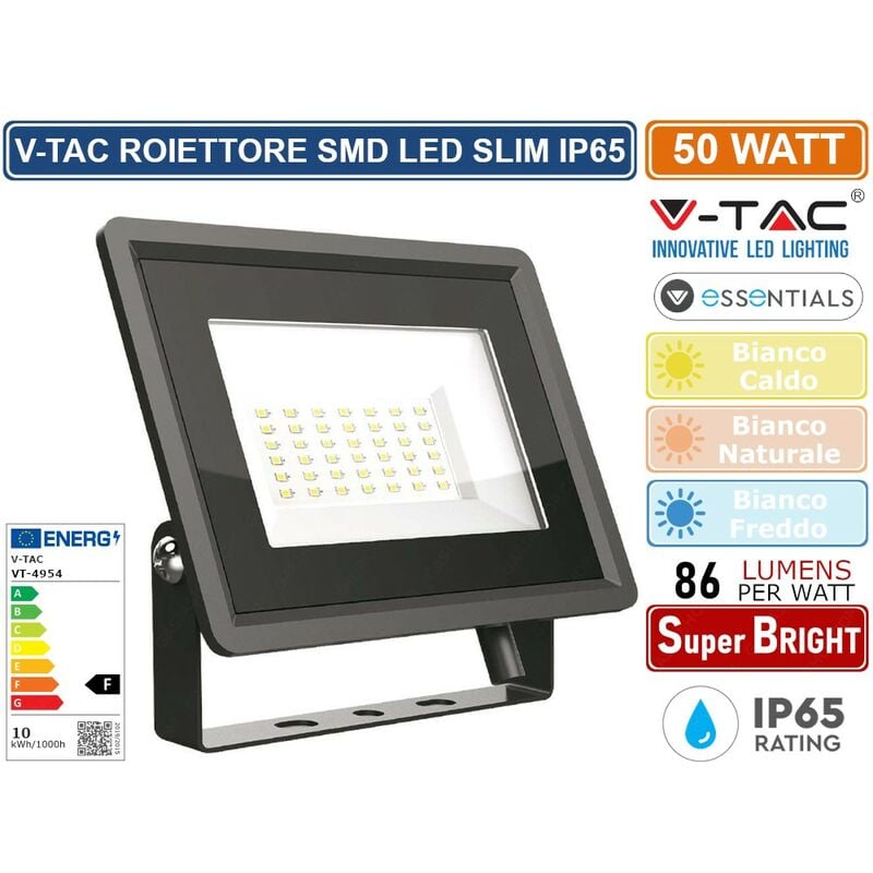 V-Tac VT-4954 è un faro LED da 50W di potenza con tecnologia LED SMD, corpo sottile in alluminio pressofuso di colore nero e copertura trasparente. Con fascio luminoso di 110° e flusso luminoso di 4300 lm, questo faro ha un rapporto di 86 lm/W . Inoltre, ha un grado di protezione IP65 che lo rende adatto ad un uso esterno anche sotto la pioggia prolungata. È predisposto per il fissaggio a parete, ed il collegamento alla rete elettrica avviene tramite cavi a saldare. SPECIFICHE TECNICHE • Potenza: 50 W • Fascio luminoso: 110° • Flusso luminoso: 4300 lm • Efficienza luminosa: 86 lm/W • Materiale: alluminio pressofuso • Colore: nero • Copertura: trasparente • Grado di protezione: IP65 • Dimensioni: 180 x 150 x 27 mm • Durata: 25.000 ore VARIANTI DISPONIBILI • Temperatura colore: 3000K (Bianca Calda) - SKU 6749 • Temperatura colore: 4000K (Bianca Naturale) - SKU 6750 • Temperatura colore: 6500K (Bianca Fredda) - SKU 6751 CONSIGLI Può essere utilizzato per l'illuminazione di garage