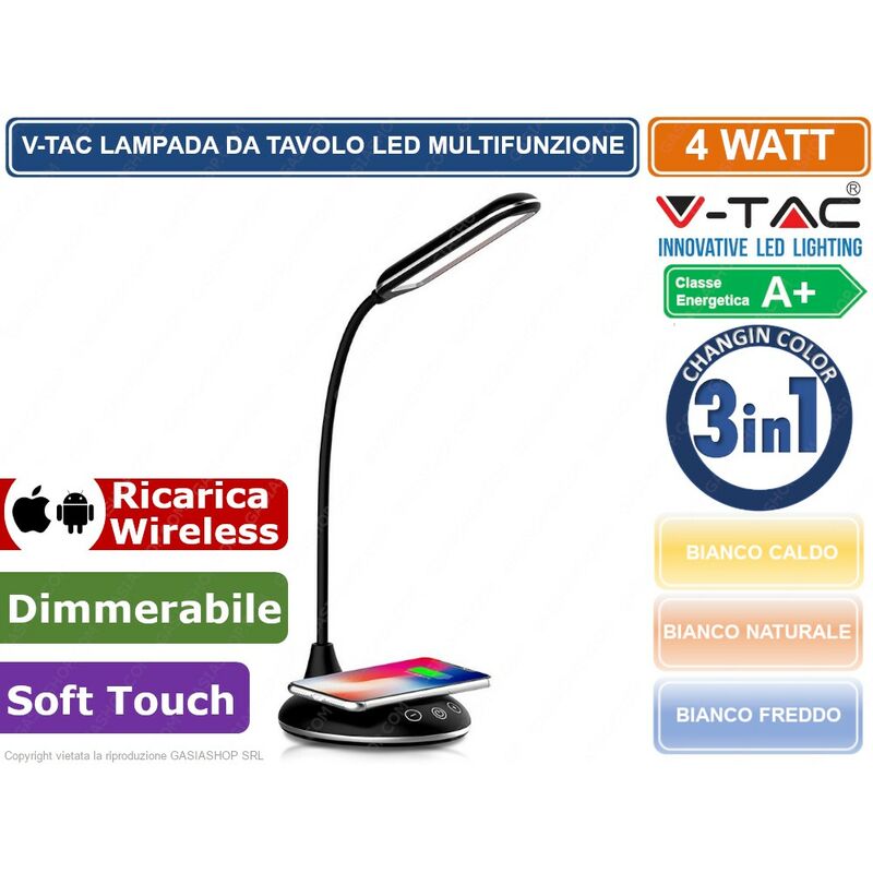 V-Tac VT-7705 lampada da tavolo LED multifunzione con potenza di 4W. Realizzata in ABS di colore nero e alluminio. Design minimale e pulito, con braccio rivestito in gomma completamente flessibile e orientabile . Base che può essere appoggiata su qualsiasi superficie piana, anche delicata, grazie al rivestimento in morbido materiale antiscivolo . Fascio luminoso diffuso e luminosità fino a 800 Lux . Tecnologia LED SMD con copertura opaca e antiabbagliamento . Tramite i tasti touch a sfioramento (con indicatore luminoso blu) è possibile controllare le seguenti funzioni: - accensione e spegnimento della lampada;