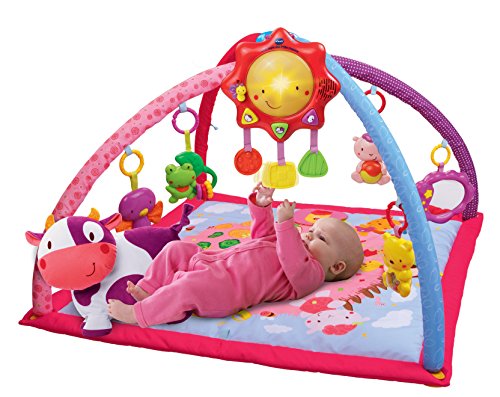 Descrizione prodotto: un tappeto evolutivo con archi che incanterà il tuo bambino. Tappeto con un peluche a forma di morbidissima mucca, 4 sonagli a forma di animale, uno specchio da appendere e un tabellone di attività interattivo e luminoso rimovibile. 24 melodie, 6 canzoni e molti effetti sonori. Pieghevole per un facile trasporto e sistemazione. Utilizzabile dalla nascita.