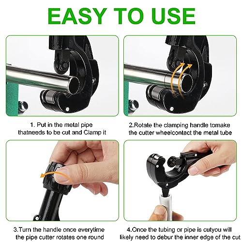 【Ampia Applicazione】Il tagliatubi a cuscinetto a sfera è perfetto per tubi in acciaio a parete sottile, ad esempio per tagliare un reggisella in acciaio o accorciare i piedi in acciaio dei mobili. Sono inclusi anche tre ruote di ricambio nella confezione.