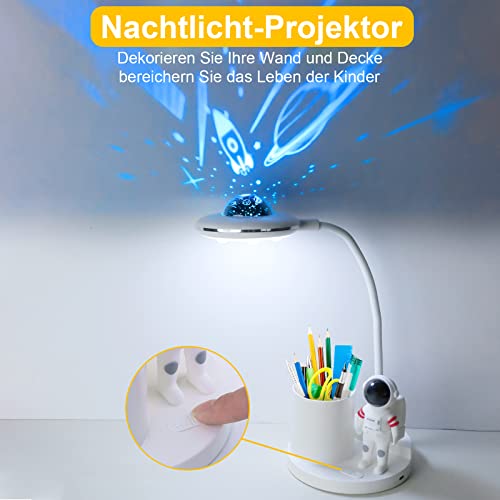 VUENICEE Lampada da Scrivania LED, Lampada da Scrivania Bambini con Portapenne e Proiezione, Lampada da Tavolo USB Ricaricabile, Dimmerabil Rotazione a 360°, per Lettori di Notte, Bambino, Studio