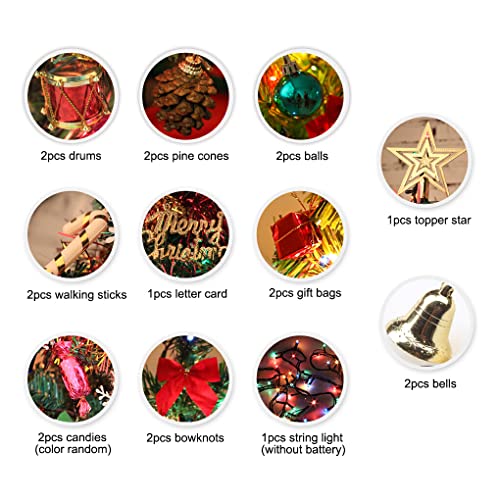 Parti intercambiabili: questo tipo di albero di Natale è dotato di 19 pezzi, inclusi 2 tamburi, 2 pigne, 2 palline, 2 bastoni da passeggio, un biglietto da visita, 2 sacchetti regalo, 2 caramelle, 2 fiocchi, un filo di luce, un topper e 2 campane
