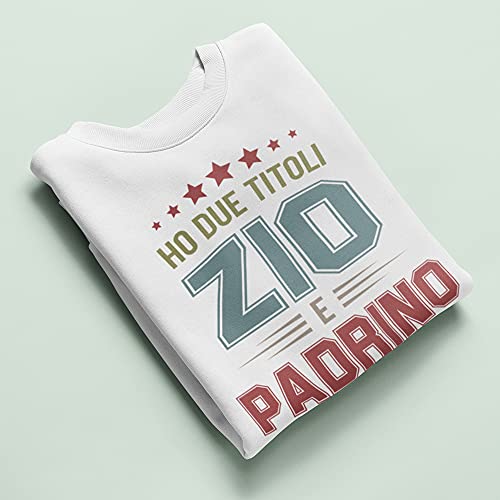 Questa felpa girocollo da uomo è perfetta come regalo per gli zii e i padrini, se vuoi regalare qualcosa di particolare non puoi rinunciare a questa felpa con la scritta "Ho due titoli zio e padrino e sono bravissimo in entrambi". Questa felpa da uomo è una perfetta idea regalo originale.