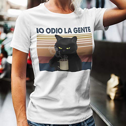 Vulfire Maglietta Donna Io odio la Gente con Immagine di Un Gatto Nero. Maglietta Divertente. Idea Regalo Simpatica. T Shirt Simpatica Gatto (L, Bianco)