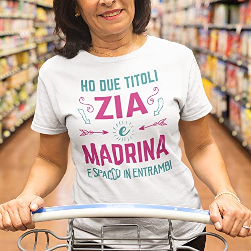 Vulfire Maglietta Donna, Io Ho Due titoli Zia e Madrina e Sono Bravissima in Entrambi, Idea Regalo per Zia, Maglia Stampa Divertente (XL, Bianco)