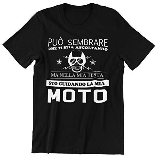 Perfetta maglietta motocross in cotone di qualità, maglietta harley davidson utilizzabile in ogni occasione in moto. Maglia divertente perfetta come idea regalo per un amico che ama le moto. La stampa di qualità con un teschio e la frase "Può sembrare che ti stia ascoltando ma nella mia testa sto guidando la mia moto" la rende un ottimo moto gadget, una vera maglietta biker da portare con se ad ogni raduno