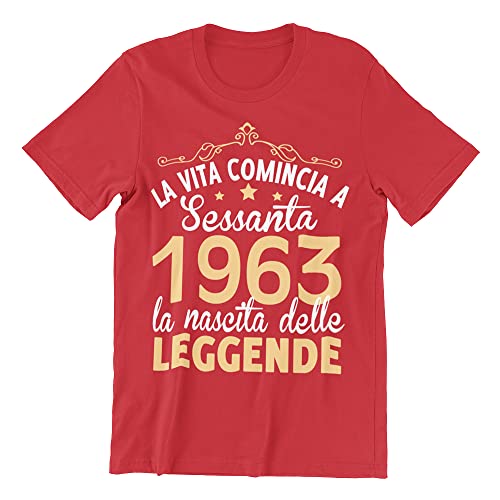 Vulfire Maglietta Uomo Idea Regalo per Compleanno, 1963 La Vita Comincia a sessanta la Nascita delle Leggende, Festa dei 60 Anni (Rosso, S)