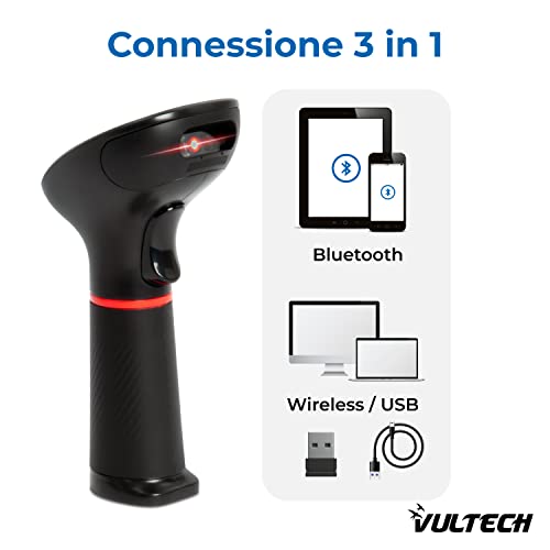 Vultech Barcode Scanner Wireless 2.4 Ghz e Bluetooth 2D,QR Code, 1D Lettore Codici a Barre Senza Fili BC-07MWBT fino a 100 metri per Computer/Notebook, Windows/MaC OS/Linux/Android/iOS