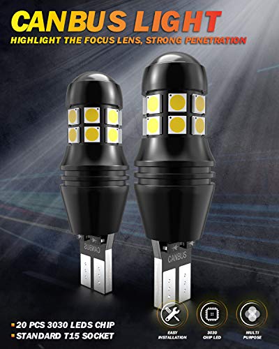 ★ 【W16W T15 912 921 LED Luce Del Freno】 Temperatura colore: 6500K Xenon White. Tensione di esercizio: 12V-24V. Potenza LED: 8W/lampadina. Con materiale in alluminio aeronautico completo, maggiore durata fino a 60.000 ore. Chip led 3030 SMD da 20 pezzi ad alta potenza e alta illuminazione. Flusso luminoso: 2000LM/lampadina. T15 W16W 921 912 Luci di retromarcia di backup per una visuale più luminosa e una guida più sicura.