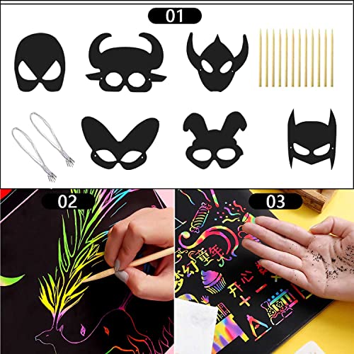 【Facile da usare】 i bambini devono solo usare i bastoncini di legno per raschiare il rivestimento nero sulla superficie graffiata e appariranno i colori dell'arcobaleno. Diversi maschere scratch art mostreranno colori diversi. È molto interessante.