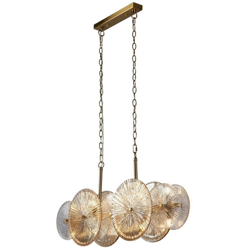 Searchlight Wagon Wheel Lampada a sospensione a 10 barre luminose, metallo color bronzo, vetro trasparente/ambrato | Finitura: ottone | Materiale: acciaio dolce e vetro | Grado di protezione IP: IP20 | Altezza: 40 cm | Altezza massima: 120 cm | Lunghezza: 90 cm | Larghezza: 16 cm | Tipo di lampada: G9 | Numero di lampade: 10 | Lampadina inclusa: no | Dimmerabile: sì - è necessaria una lampadina dimmerabile | Peso: 8,32 kg | Potenza (massima): 33 W