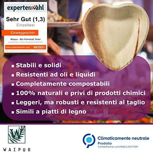 Waipur Piatti in Foglia di Palma Biologici - 200 Piatti a Forma di Cuore 10 cm - Piatti usa e getta Compostabili di Alta Qualità - Leggeri ma Resistenti - Come Piatti di Bamboo