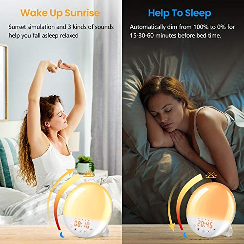 Wake-Up Light, SOLMORE Sveglia Luce con Luce di Sveglia Alba/Simulatore di Luce Solare con Radio FM/ 7 Colori di Luce/ 7 Suoni/Controllo Touch, Snooze, Ricaricabile con Cavo USB
