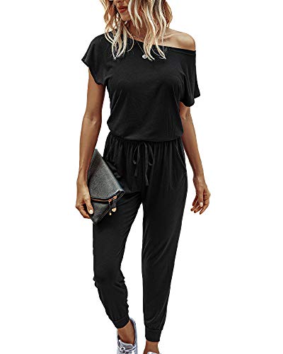 Walant Donne Tuta maniche corte Collo Rotondo Colore Tinta Unita Jumpsuit D'Estate Chic Slim Pantaloni Taglia Elastico Casual Combishort con Tasche, Nero, L