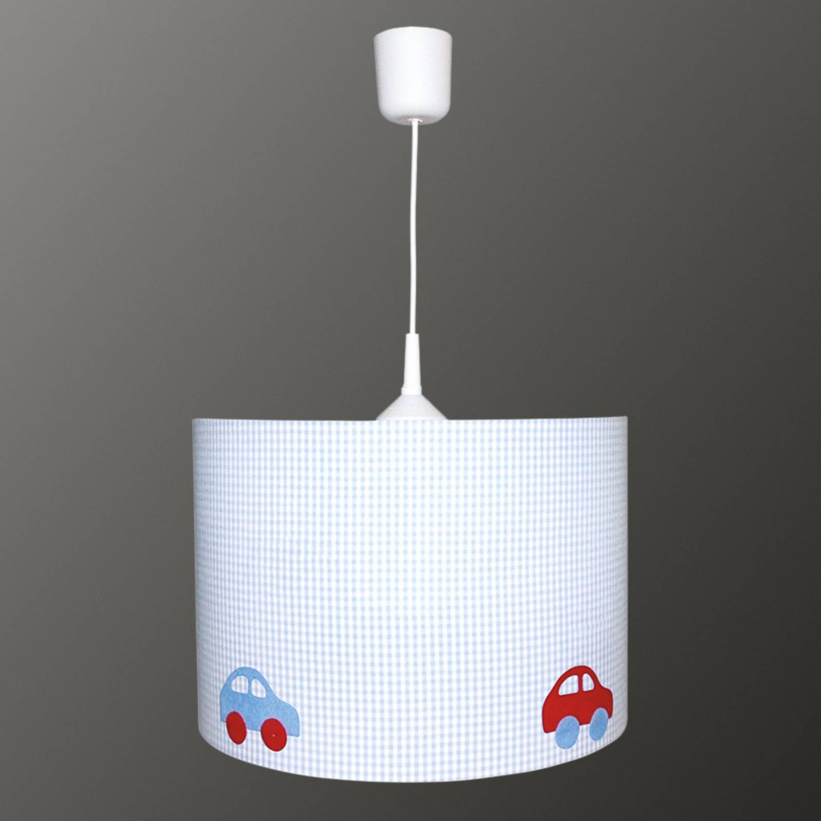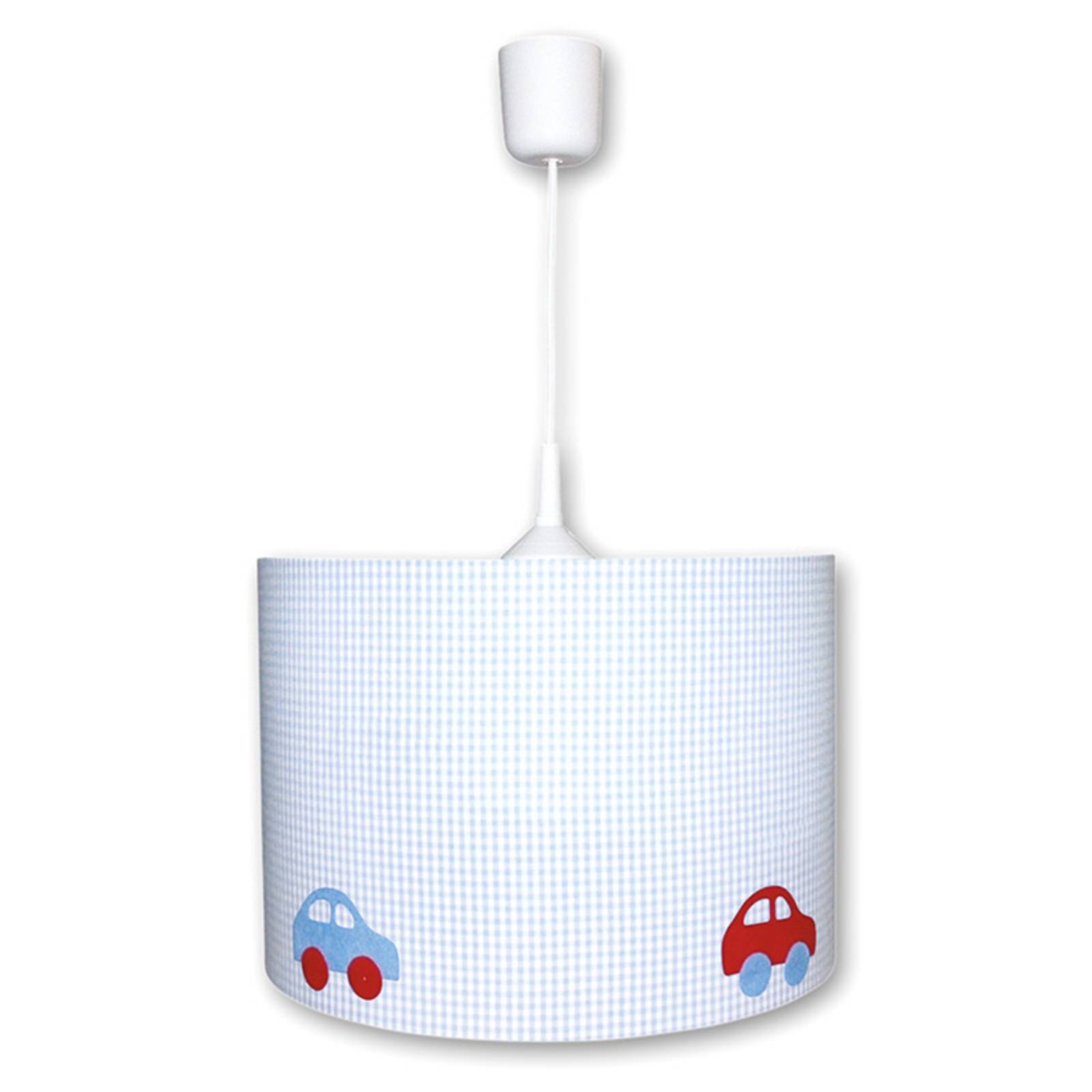 Divertente lampada a sospensione AUTO con motivo azzurro L'allegra lampada a sospensione AUTO è ideale per la camera dei bambini. Le piccole e semplici automobili e i ricorrenti colori vivaci blu, rosso e bianco attirano sia le ragazze che i ragazzi. Il paralume, che è a scacchiera in morbido azzurro e bianco, è in cotone e la sospensione è in plastica. Con i suoi 100 watt di potenza, la lampada a sospensione AUTO produce una luce brillante che è ben distribuita dal paralume e non sembra troppo forte. È particolarmente importante che gli oggetti con cui i bambini vengono a contatto siano innocui. Qui i genitori possono essere completamente rassicurati: L'apparecchio certificato TÜV soddisfa elevati standard di qualità. Il produttore, con sede e produzione in Germania, utilizza materiali sicuri. Non c'è cadmio nella plastica utilizzata, che può danneggiare la salute e l'ambiente. Le lampade sono fatte a mano, anche il cotone del paralume è arrotolato a mano.